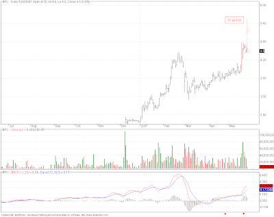 Look at BPC go, it gradually moved up. Now, it's forming a flag around the 4.5-4.75. If it breaks the 4.75 it will continue up to the target price @ 5.50.